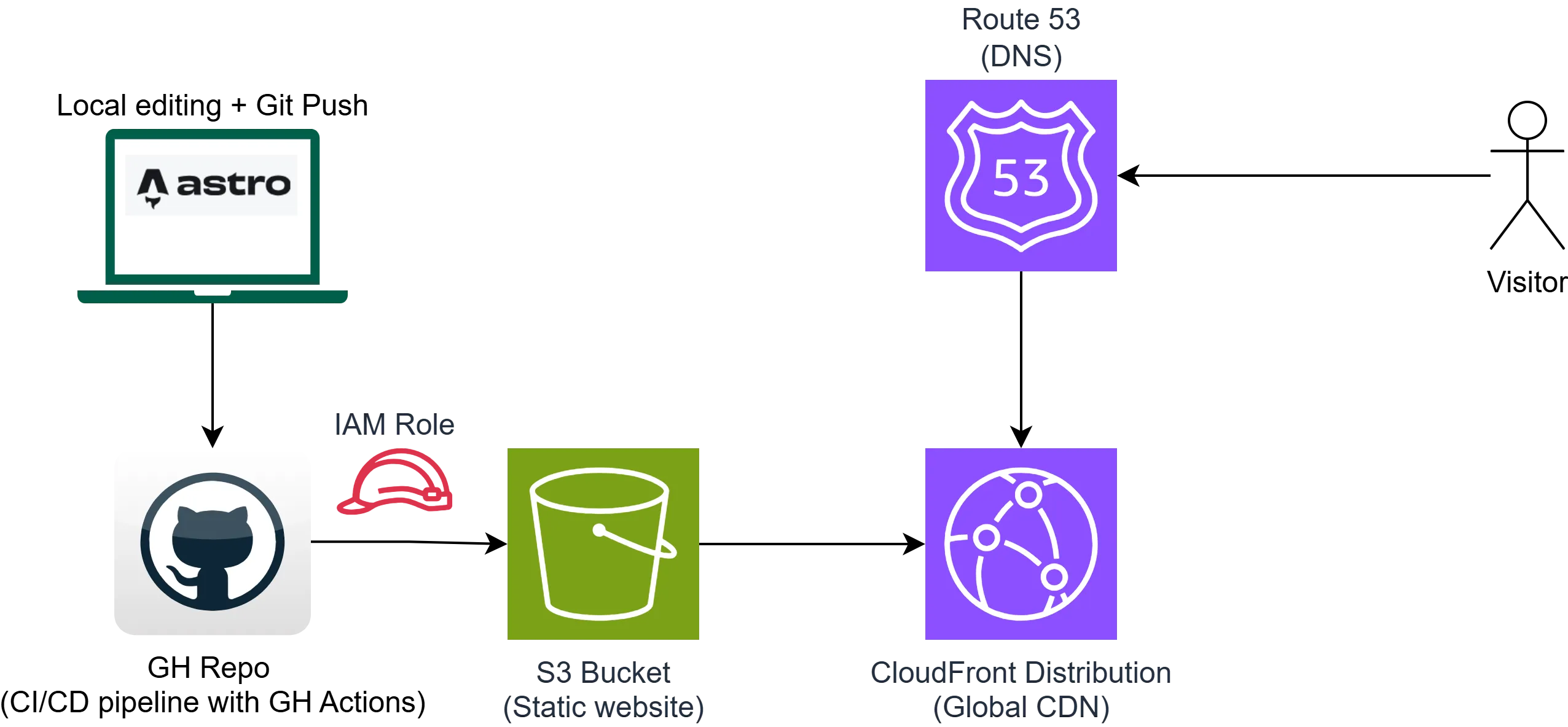 Using Astro allows me to create a fully static website that I can host on S3, serve it through CloudFront and still have good editing capabilities through Keystatic CMS. I can do the edits locally, push them to Github and from there the CI/CD pipeline will pick it up, build the static website and deploy it to S3.